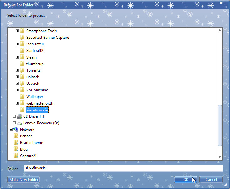 เมื่อตั้งรหัสผ่านเสร็จแล้ว My LockBox ก็จะถามว่าจะให้ ล็อคและซ่อน โฟลเดอร์ไหน เราก็เลือกโฟลเดอร์ที่เราต้องการได้เลยครับ ซึ่งในเวอร์ชั่นฟรี มีข้อจำกัดก็คือ จะล็อคได้แค่โฟลเดอร์เดียวเท่านั้นครับ